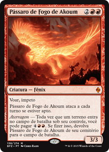 | Rules | Flying, haste Akoum Firebird attacks each combat if able. Landfall — Whenever a land enters the battlefield under your control, you may pay . If you do, return Akoum Firebird from your graveyard to the battlefield. |