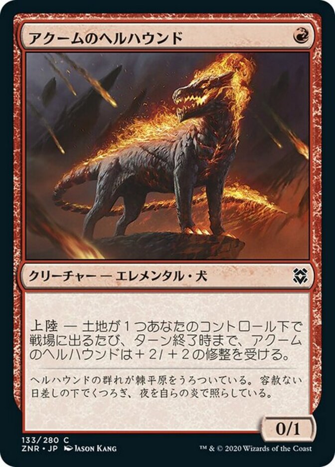 | Rules | Landfall — Whenever a land enters the battlefield under your control, Akoum Hellhound gets +2/+2 until end of turn. |
