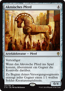 | Rules | Defender When Akroan Horse enters the battlefield, an opponent gains control of it. At the beginning of your upkeep, each opponent creates a 1/1 white Soldier creature token. |