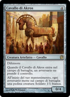 | Rules | Defender When Akroan Horse enters the battlefield, an opponent gains control of it. At the beginning of your upkeep, each opponent creates a 1/1 white Soldier creature token. |