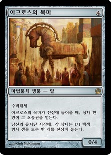 | Rules | Defender When Akroan Horse enters the battlefield, an opponent gains control of it. At the beginning of your upkeep, each opponent creates a 1/1 white Soldier creature token. |