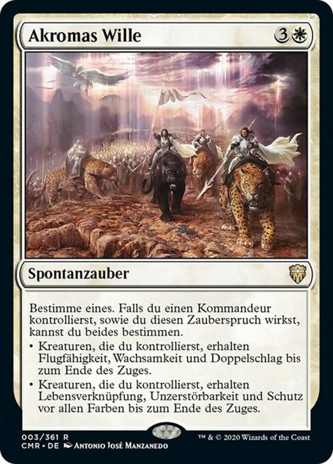 | Rules | Choose one. If you control a commander as you cast this spell, you may choose both. • Creatures you control gain flying, vigilance, and double strike until end of turn. • Creatures you control gain lifelink, indestructible, and protection from all colors until end of turn. |