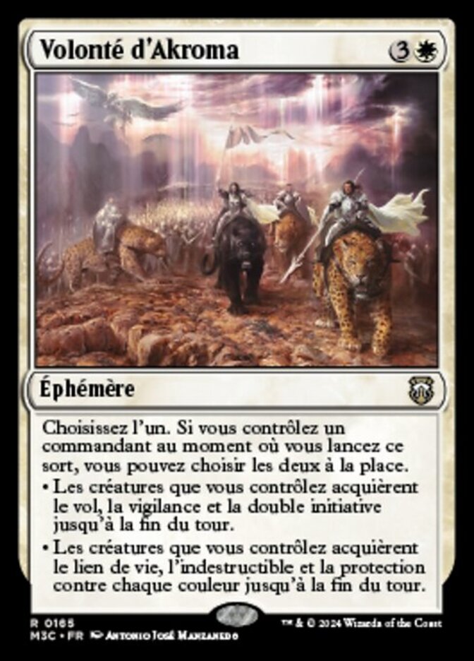 | Rules | Choose one. If you control a commander as you cast this spell, you may choose both. • Creatures you control gain flying, vigilance, and double strike until end of turn. • Creatures you control gain lifelink, indestructible, and protection from all colors until end of turn. |