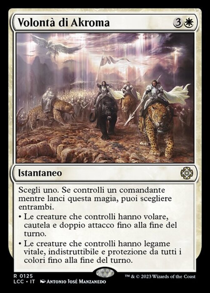 | Rules | Choose one. If you control a commander as you cast this spell, you may choose both. • Creatures you control gain flying, vigilance, and double strike until end of turn. • Creatures you control gain lifelink, indestructible, and protection from all colors until end of turn. |