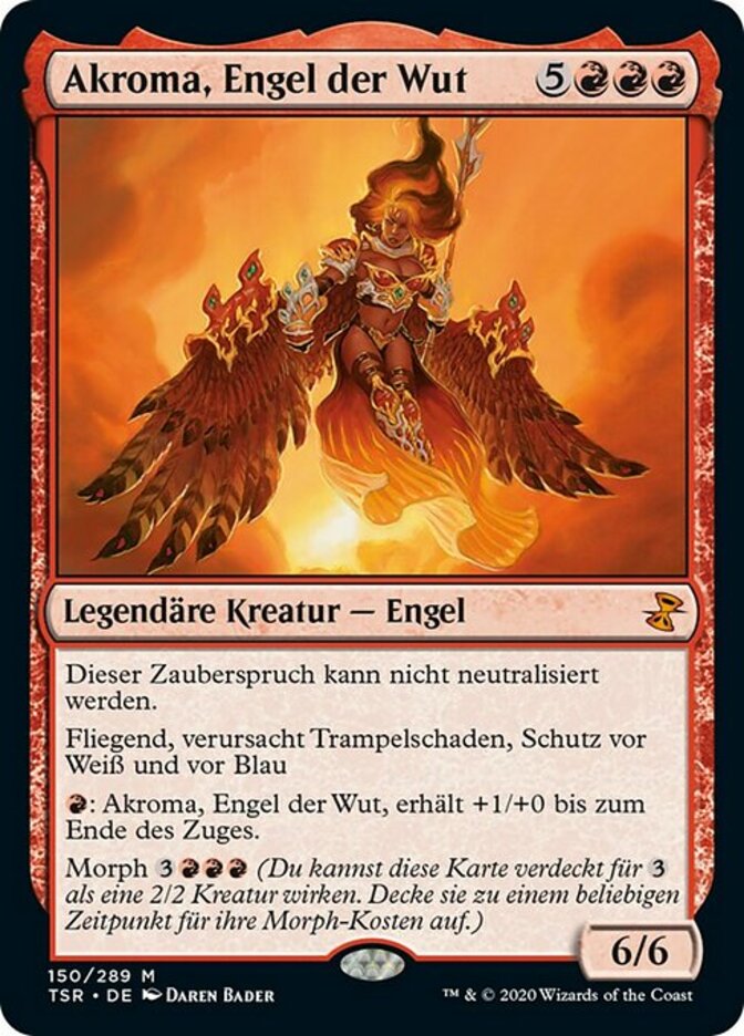 | Rules | This spell can't be countered. Flying, trample, protection from white and from blue : Akroma, Angel of Fury gets +1/+0 until end of turn. Morph (You may cast this card face down as a 2/2 creature for . Turn it face up any time for its morph cost.) |