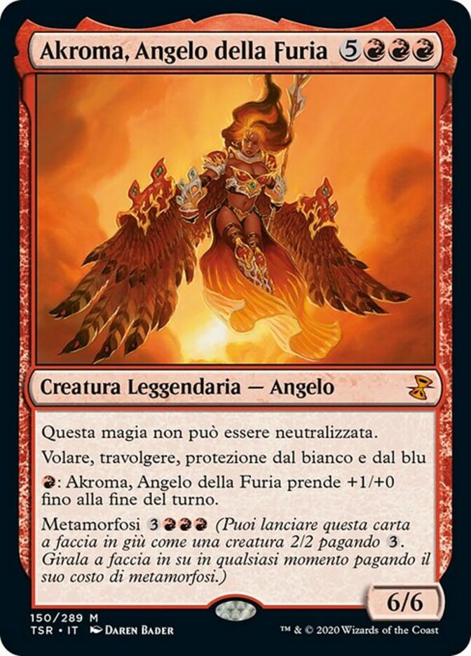 | Rules | This spell can't be countered. Flying, trample, protection from white and from blue : Akroma, Angel of Fury gets +1/+0 until end of turn. Morph (You may cast this card face down as a 2/2 creature for . Turn it face up any time for its morph cost.) |