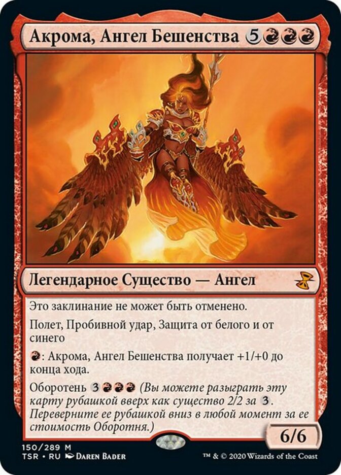 | Rules | This spell can't be countered. Flying, trample, protection from white and from blue : Akroma, Angel of Fury gets +1/+0 until end of turn. Morph (You may cast this card face down as a 2/2 creature for . Turn it face up any time for its morph cost.) |