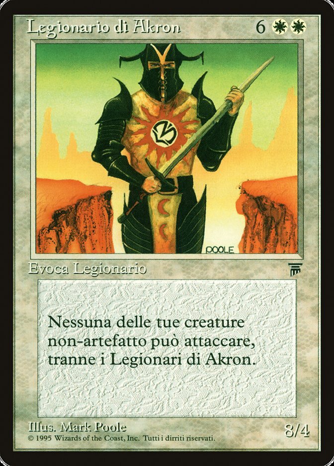| Rules | Except for creatures named Akron Legionnaire and artifact creatures, creatures you control can't attack. |