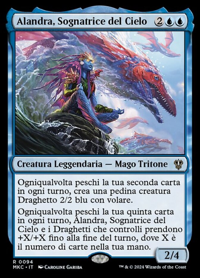 | Rules | Whenever you draw your second card each turn, create a 2/2 blue Drake creature token with flying. Whenever you draw your fifth card each turn, Alandra, Sky Dreamer and Drakes you control each get +X/+X until end of turn, where X is the number of cards in your hand. |