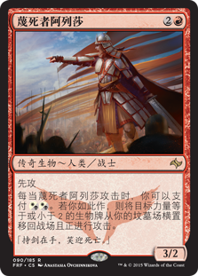 | Rules | First strike Whenever Alesha, Who Smiles at Death attacks, you may pay . If you do, return target creature card with power 2 or less from your graveyard to the battlefield tapped and attacking. |