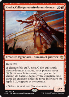 Whenever Alesha, Who Smiles at Death attacks, you may pay . If you do, return target creature card with power 2 or less from your graveyard to the battlefield tapped and attacking.