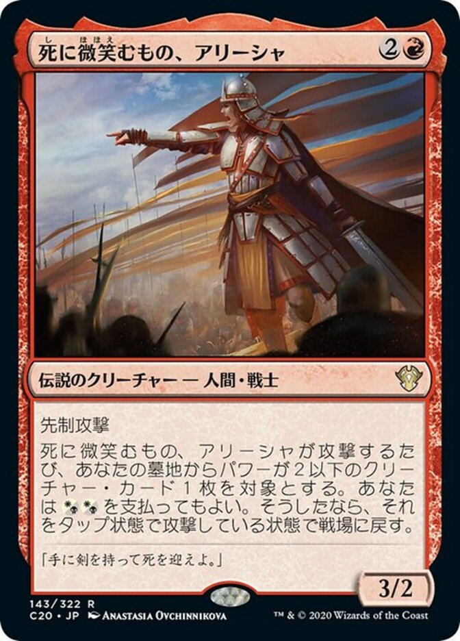 | Rules | First strike Whenever Alesha, Who Smiles at Death attacks, you may pay . If you do, return target creature card with power 2 or less from your graveyard to the battlefield tapped and attacking. |
