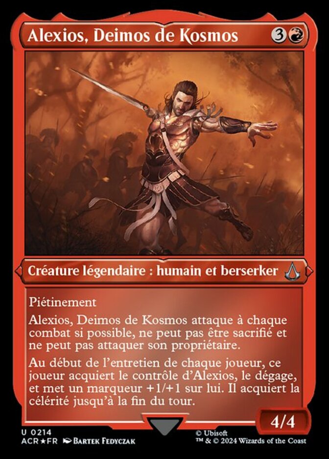 | Rules | Trample Alexios, Deimos of Kosmos attacks each combat if able, can't be sacrificed, and can't attack its owner. At the beginning of each player's upkeep, that player gains control of Alexios, untaps it, and puts a +1/+1 counter on it. It gains haste until end of turn. |