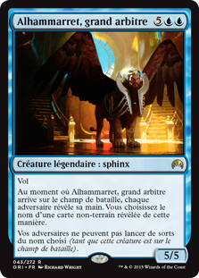 | Rules | Flying As Alhammarret, High Arbiter enters the battlefield, each opponent reveals their hand. You choose the name of a nonland card revealed this way. Your opponents can't cast spells with the chosen name (as long as this creature is on the battlefield). |