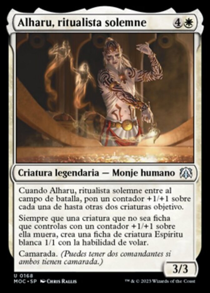 | Rules | When Alharu, Solemn Ritualist enters the battlefield, put a +1/+1 counter on each of up to two other target creatures. Whenever a nontoken creature you control with a +1/+1 counter on it dies, create a 1/1 white Spirit creature token with flying. Partner (You can have two commanders if both have partner.) |