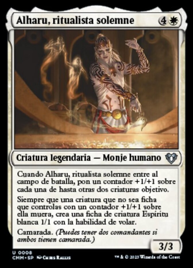 | Rules | When Alharu, Solemn Ritualist enters the battlefield, put a +1/+1 counter on each of up to two other target creatures. Whenever a nontoken creature you control with a +1/+1 counter on it dies, create a 1/1 white Spirit creature token with flying. Partner (You can have two commanders if both have partner.) |