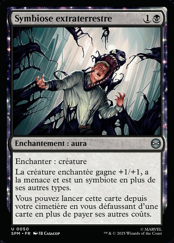 | Rules | Enchant creature Enchanted creature gets +1/+1, has menace, and is a Symbiote in addition to its other types. You may cast this card from your graveyard by discarding a card in addition to paying its other costs. |