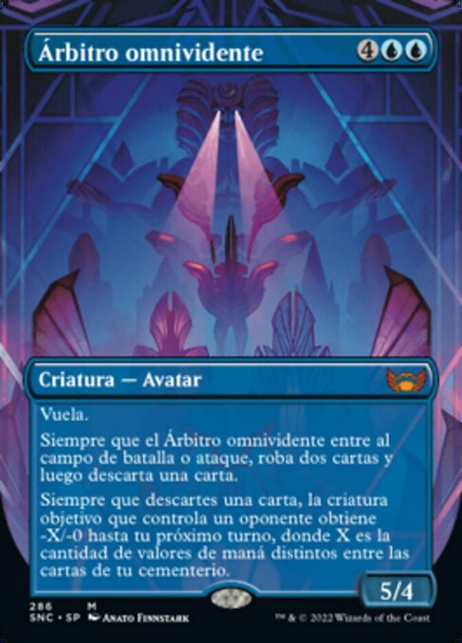 | Rules | Flying Whenever All-Seeing Arbiter enters the battlefield or attacks, draw two cards, then discard a card. Whenever you discard a card, target creature an opponent controls gets -X/-0 until your next turn, where X is the number of different mana values among cards in your graveyard. |