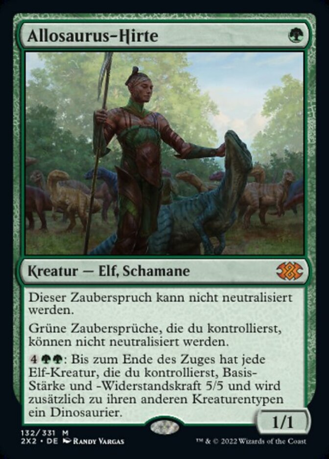 | Rules | Allosaurus Shepherd can't be countered. Green spells you control can't be countered. : Until end of turn, each Elf creature you control has base power and toughness 5/5 and becomes a Dinosaur in addition to its other creature types. |