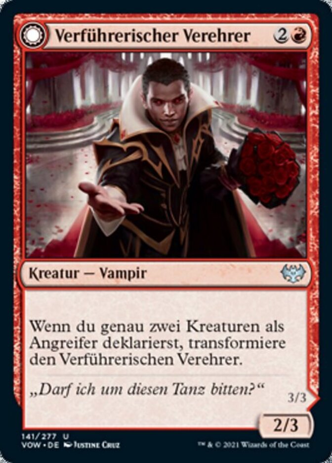 | Rules | When you attack with exactly two creatures, transform Alluring Suitor. // Trample When this creature transforms into Deadly Dancer, add . Until end of turn, you don't lose this mana as steps and phases end. : Deadly Dancer and another target creature each get +1/+0 until end of turn. |