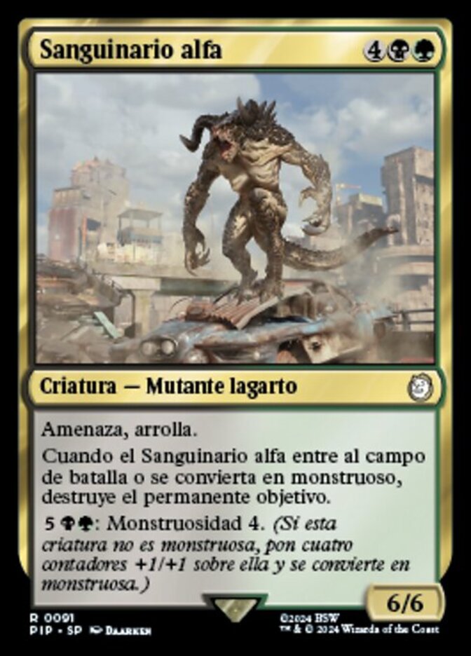 | Rules | Menace, trample When Alpha Deathclaw enters the battlefield or becomes monstrous, destroy target permanent. : Monstrosity 4. (If this creature isn't monstrous, put four +1/+1 counters on it and it becomes monstrous.) |