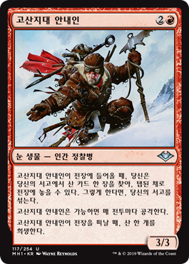 | Rules | When Alpine Guide enters the battlefield, you may search your library for a Mountain card, put that card onto the battlefield tapped, then shuffle. Alpine Guide attacks each combat if able. When Alpine Guide leaves the battlefield, sacrifice a Mountain. |