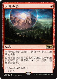 | Rules | As Alpine Moon enters the battlefield, choose a nonbasic land card name. Lands your opponents control with the chosen name lose all land types and abilities, and they gain ": Add one mana of any color." |