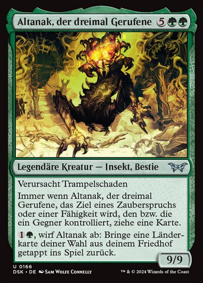 | Rules | Trample Whenever Altanak, the Thrice-Called becomes the target of a spell or ability an opponent controls, draw a card. , Discard Altanak, the Thrice-Called: Return target land card from your graveyard to the battlefield tapped. |
