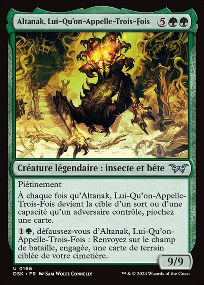 | Rules | Trample Whenever Altanak, the Thrice-Called becomes the target of a spell or ability an opponent controls, draw a card. , Discard Altanak, the Thrice-Called: Return target land card from your graveyard to the battlefield tapped. |