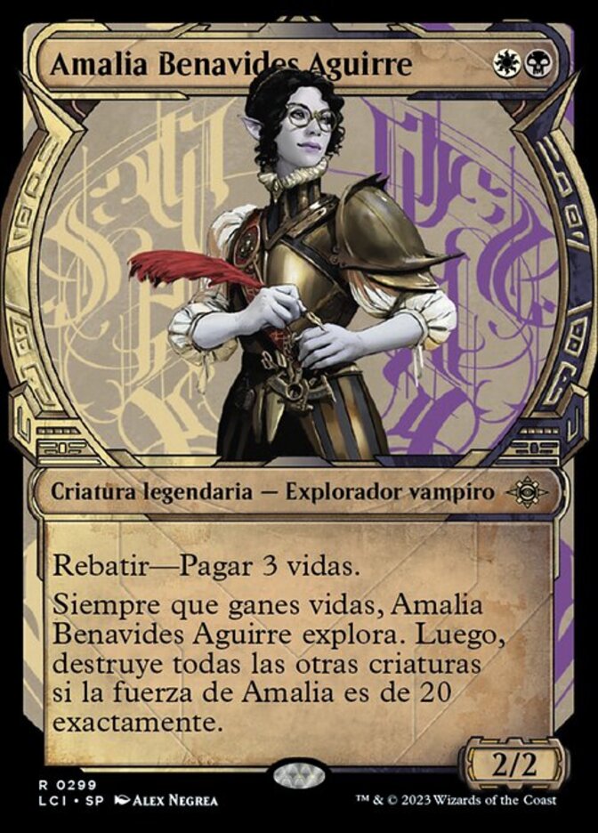 | Rules | Ward—Pay 3 life. Whenever you gain life, Amalia Benavides Aguirre explores. Then, destroy all other creatures if its power is exactly 20. (To have this creature explore, reveal the top card of your library. Put that card into your hand if it's a land. Otherwise, put a +1/+1 counter on this creature, then put the card back or put it into your graveyard.) |