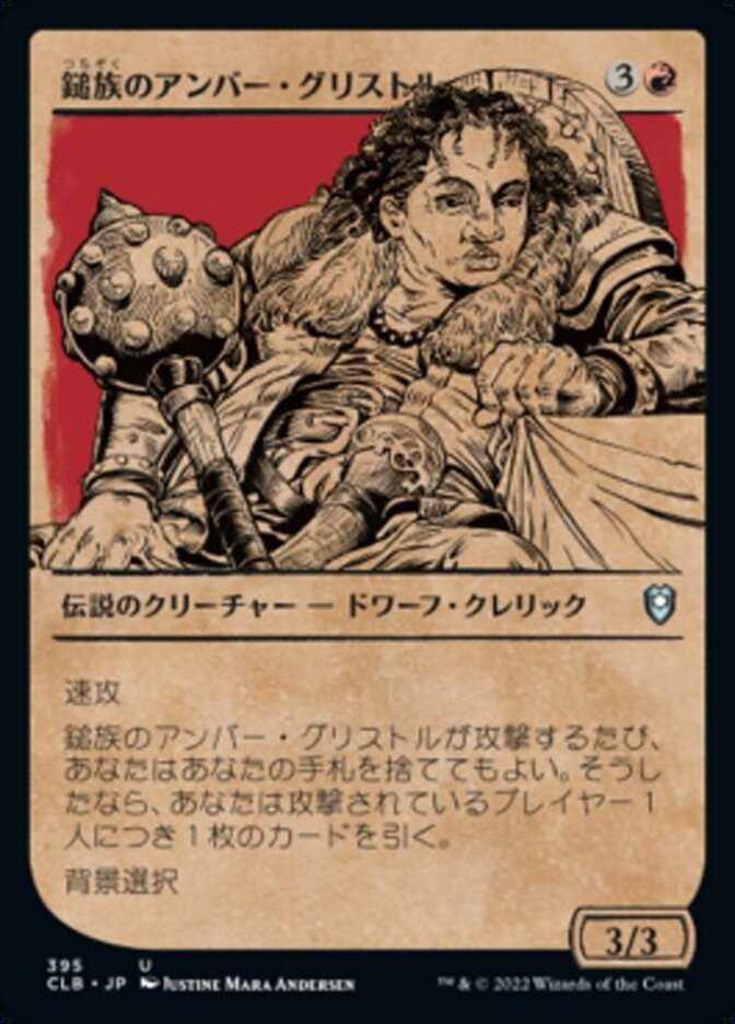 | Rules | Haste Whenever Amber Gristle O'Maul attacks, you may discard your hand. If you do, draw a card for each player you're attacking. Choose a Background (You can have a Background as a second commander.) |