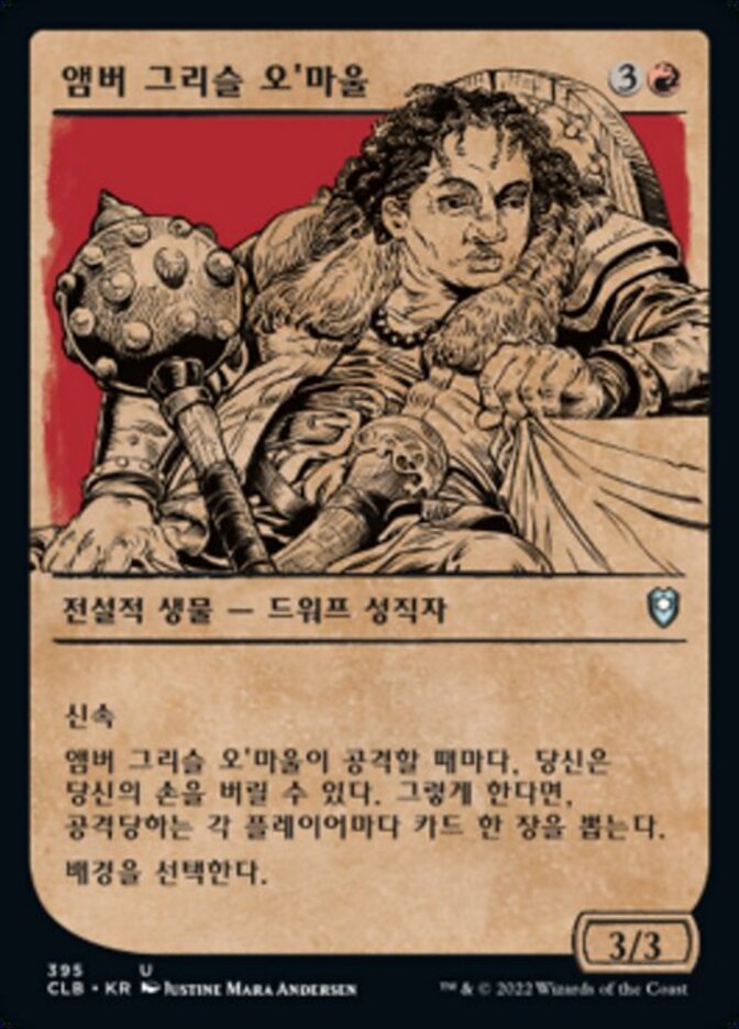 | Rules | Haste Whenever Amber Gristle O'Maul attacks, you may discard your hand. If you do, draw a card for each player you're attacking. Choose a Background (You can have a Background as a second commander.) |