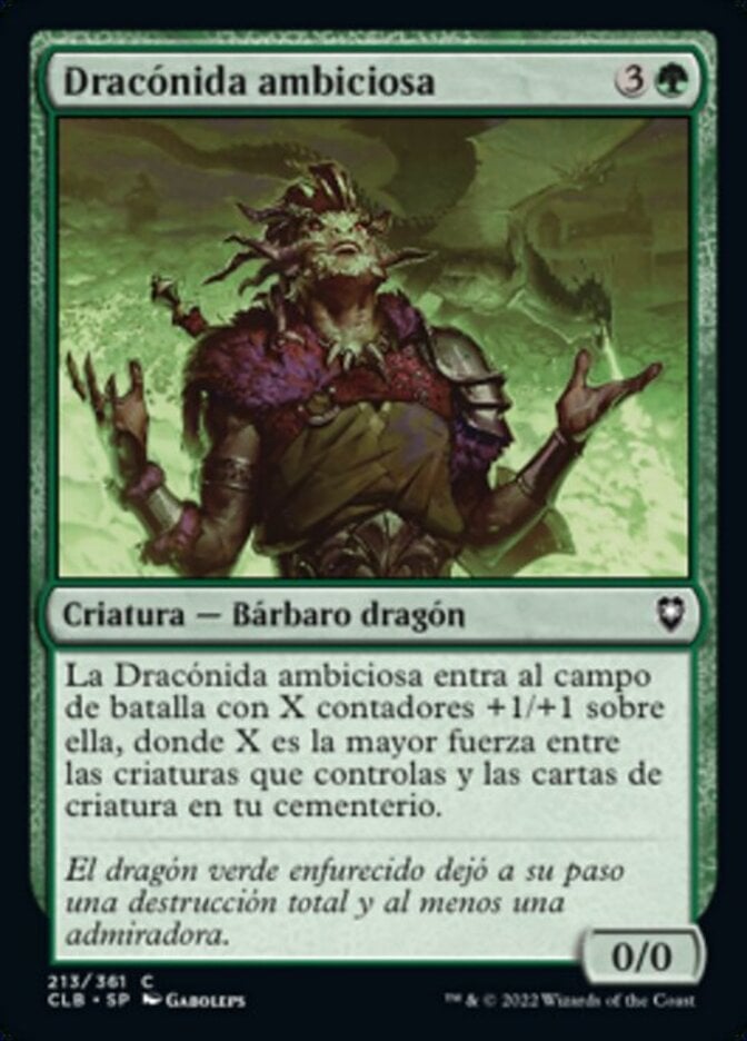 | Rules | Ambitious Dragonborn enters the battlefield with X +1/+1 counters on it, where X is the greatest power among creatures you control and creature cards in your graveyard. |