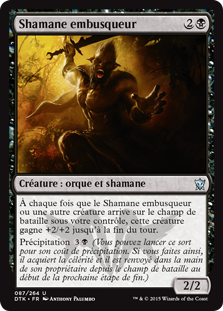 | Rules | Whenever Ambuscade Shaman or another creature enters the battlefield under your control, that creature gets +2/+2 until end of turn. Dash (You may cast this spell for its dash cost. If you do, it gains haste, and it's returned from the battlefield to its owner's hand at the beginning of the next end step.) |