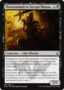 | Rules | Whenever Ambuscade Shaman or another creature enters the battlefield under your control, that creature gets +2/+2 until end of turn. Dash (You may cast this spell for its dash cost. If you do, it gains haste, and it's returned from the battlefield to its owner's hand at the beginning of the next end step.) |