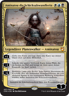 | Rules | +1: Draw a card, then put a card from your hand on top of your library. −1: Exile another target permanent you own, then return it to the battlefield under your control. −6: Choose left or right. Each player gains control of all nonland permanents other than Aminatou, the Fateshifter controlled by the next player in the chosen direction. Aminatou, the Fateshifter can be your commander. |