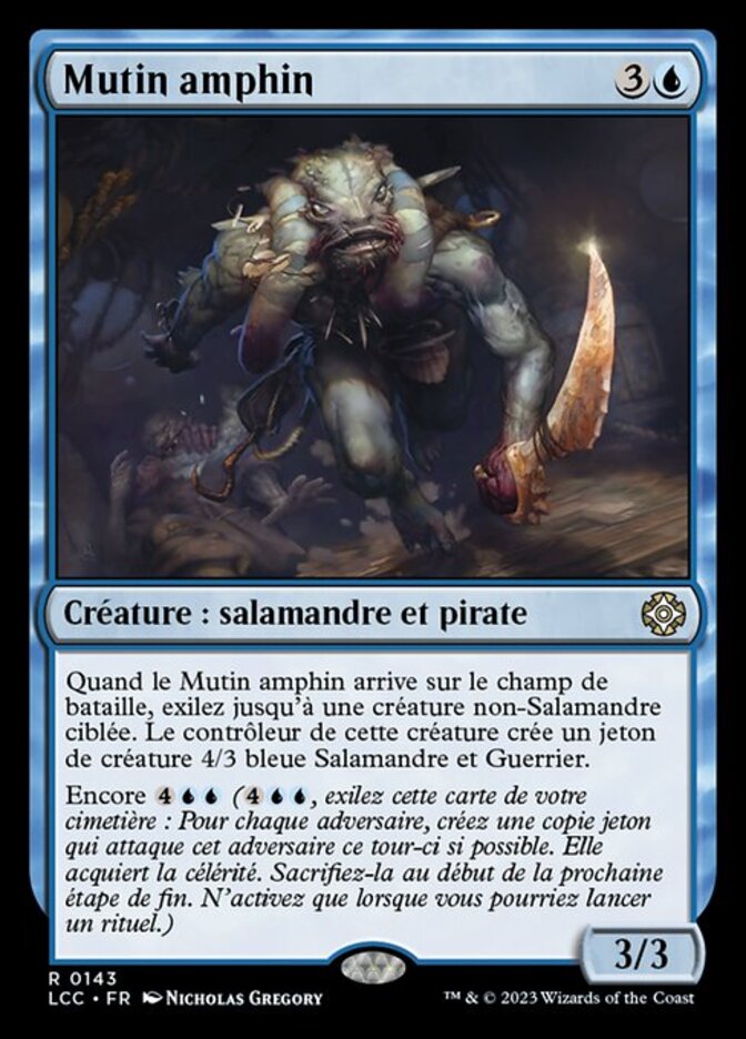 | Rules | When Amphin Mutineer enters the battlefield, exile up to one target non-Salamander creature. That creature's controller creates a 4/3 blue Salamander Warrior creature token. Encore (, Exile this card from your graveyard: For each opponent, create a token copy that attacks that opponent this turn if able. They gain haste. Sacrifice them at the beginning of the next end step. Activate only as a sorcery.) |