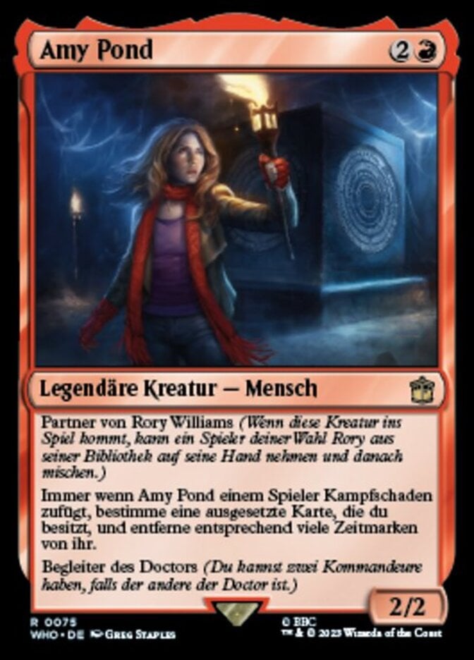 | Rules | Partner with Rory Williams (When this creature enters the battlefield, target player may put Rory into their hand from their library, then shuffle.) Whenever Amy Pond deals combat damage to a player, choose a suspended card you own and remove that many time counters from it. Doctor's companion (You can have two commanders if the other is the Doctor.) |