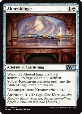 | Rules | When Ancestral Blade enters the battlefield, create a 1/1 white Soldier creature token, then attach Ancestral Blade to it. Equipped creature gets +1/+1. Equip (: Attach to target creature you control. Equip only as a sorcery.) |