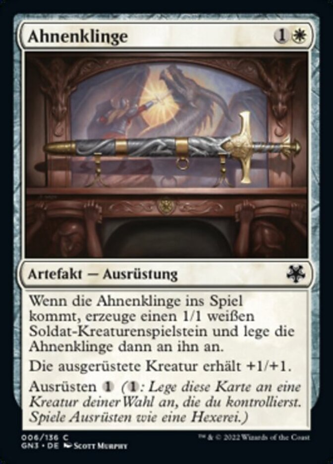 | Rules | When Ancestral Blade enters the battlefield, create a 1/1 white Soldier creature token, then attach Ancestral Blade to it. Equipped creature gets +1/+1. Equip (: Attach to target creature you control. Equip only as a sorcery.) |