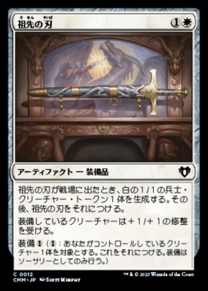 | Rules | When Ancestral Blade enters the battlefield, create a 1/1 white Soldier creature token, then attach Ancestral Blade to it. Equipped creature gets +1/+1. Equip (: Attach to target creature you control. Equip only as a sorcery.) |