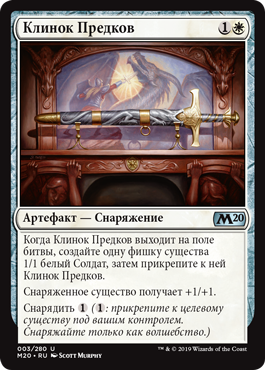 | Rules | When Ancestral Blade enters the battlefield, create a 1/1 white Soldier creature token, then attach Ancestral Blade to it. Equipped creature gets +1/+1. Equip (: Attach to target creature you control. Equip only as a sorcery.) |