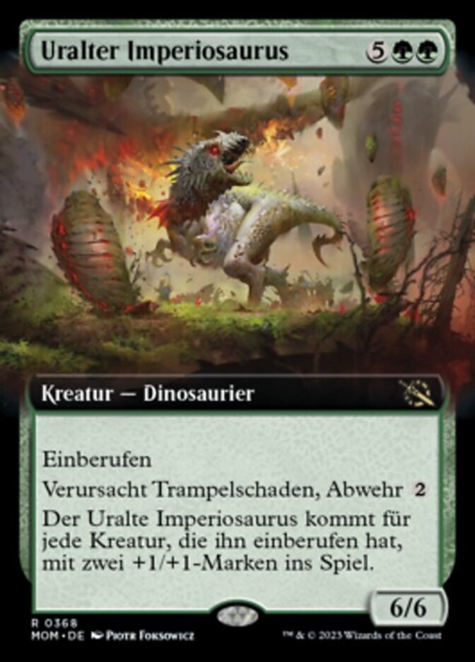 | Rules | Convoke (Your creatures can help cast this spell. Each creature you tap while casting this spell pays for or one mana of that creature's color.) Trample, ward Ancient Imperiosaur enters the battlefield with two +1/+1 counters on it for each creature that convoked it. |