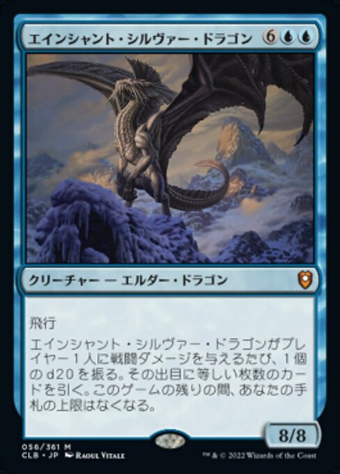 | Rules | Flying Whenever Ancient Silver Dragon deals combat damage to a player, roll a d20. Draw cards equal to the result. You have no maximum hand size for the rest of the game. |