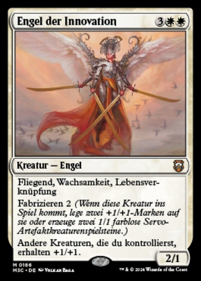 | Rules | Flying, vigilance, lifelink Fabricate 2 (When this creature enters the battlefield, put two +1/+1 counters on it or create two 1/1 colorless Servo artifact creature tokens.) Other creatures you control get +1/+1. |
