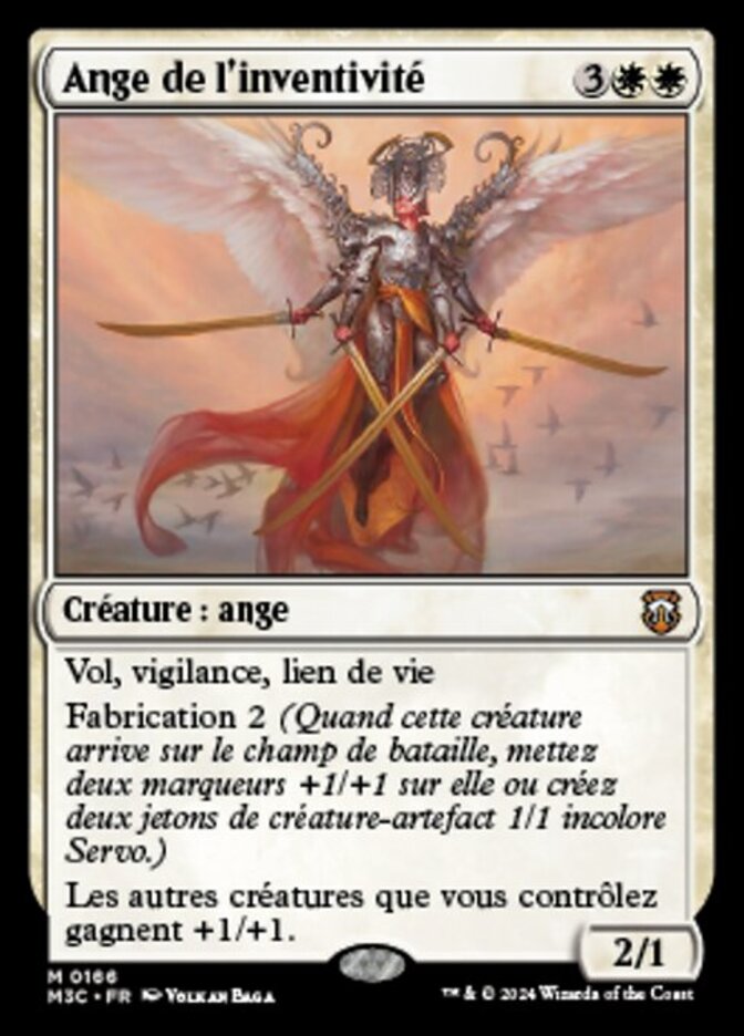 | Rules | Flying, vigilance, lifelink Fabricate 2 (When this creature enters the battlefield, put two +1/+1 counters on it or create two 1/1 colorless Servo artifact creature tokens.) Other creatures you control get +1/+1. |