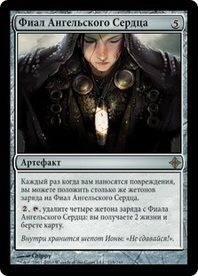 | Rules | Whenever you're dealt damage, you may put that many charge counters on Angelheart Vial. , , Remove four charge counters from Angelheart Vial: You gain 2 life and draw a card. |
