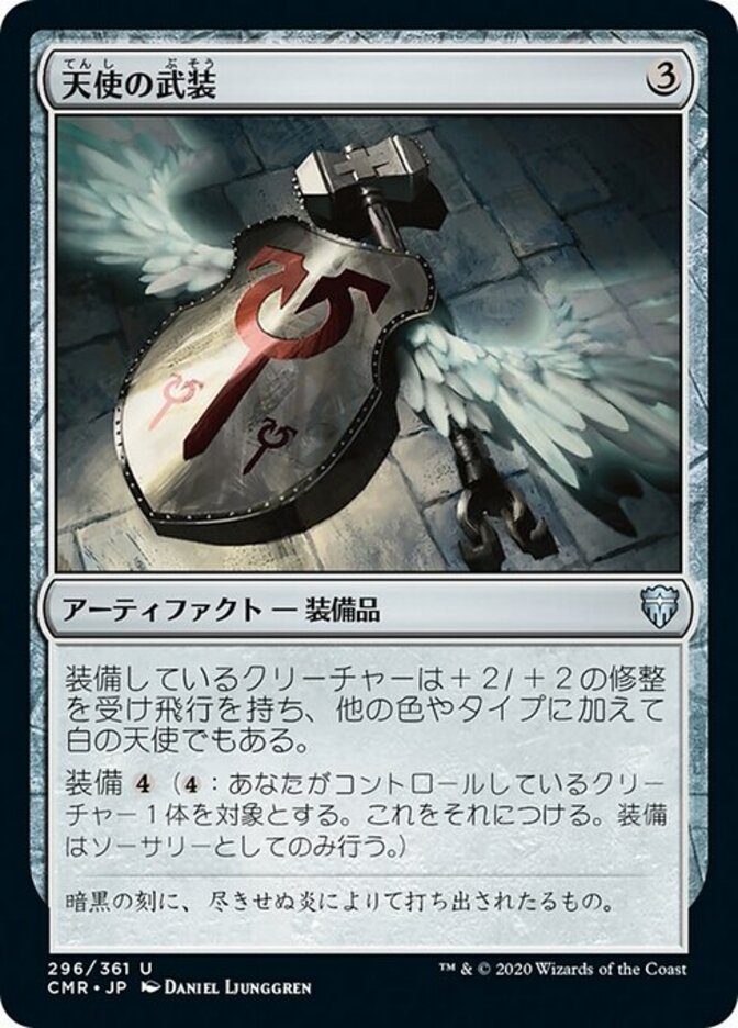 | Rules | Equipped creature gets +2/+2, has flying, and is a white Angel in addition to its other colors and types. Equip (: Attach to target creature you control. Equip only as a sorcery.) |