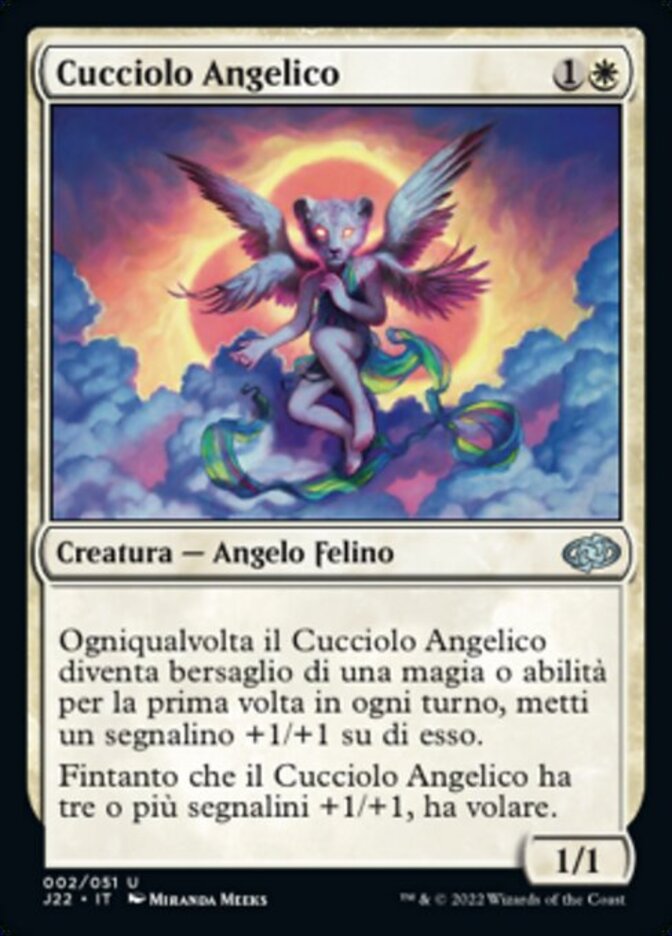 | Rules | Whenever Angelic Cub becomes the target of a spell or ability for the first time each turn, put a +1/+1 counter on it. As long as Angelic Cub has three or more +1/+1 counters on it, it has flying. |