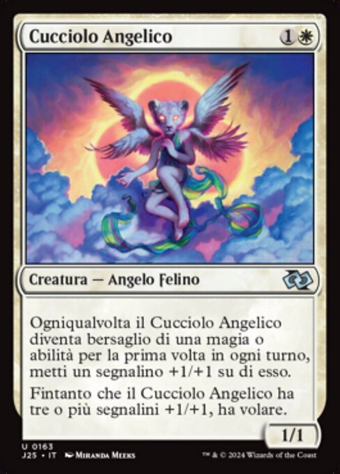 | Rules | Whenever Angelic Cub becomes the target of a spell or ability for the first time each turn, put a +1/+1 counter on it. As long as Angelic Cub has three or more +1/+1 counters on it, it has flying. |